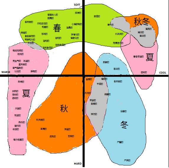 伊顿在《色彩艺术》一书中说:“色彩的效果不仅在视觉上,而且在心理上应该得到体会和理解。”日本色彩设计研究所小林重顿根据季节的色彩变化绘制出季节的色彩形象坐标,如下图所示: